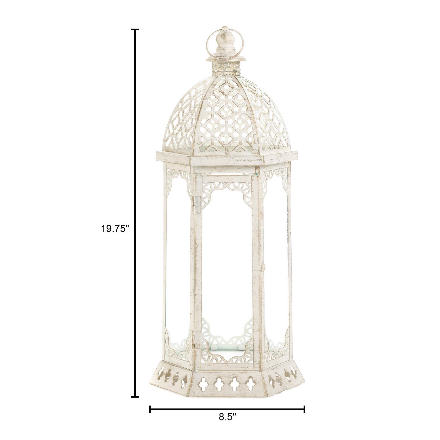 • Turn candlelight into a grand affair with this glorious iron candle lantern. Its vintage white finish is the perfect complement to its embellished cutouts and flourishes, and the clear glass panels are the perfect way to showcase your favorite candle.