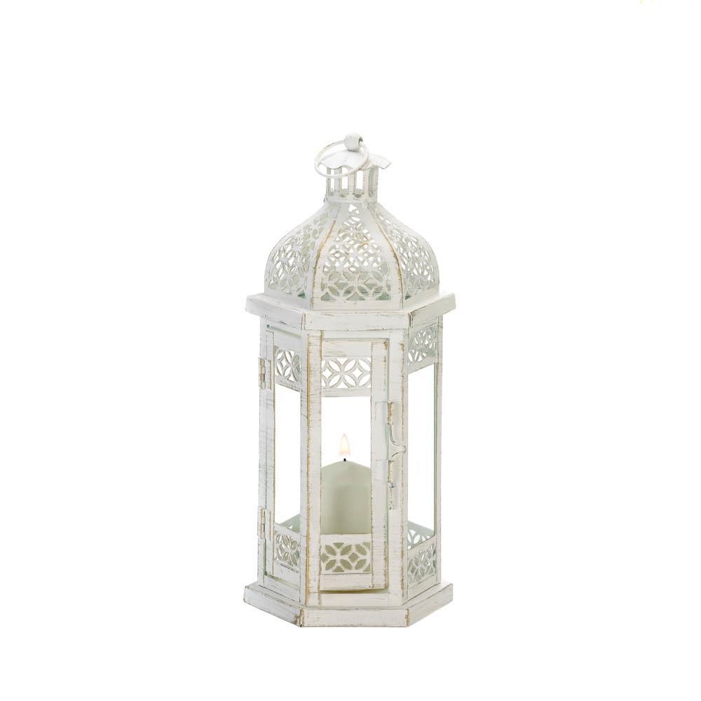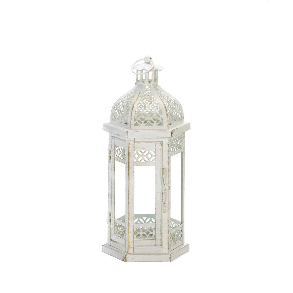 • A feminine update on a classic design, this antique-style floral lantern will instantly warm up any space. Suitable for both indoor and outdoor use, this decorative candle lantern, in an antique white finish, features beautiful floral cut-out detailing and a charming hexagonal frame. Place a small candle inside the lantern to illuminate your space in a soft and dreamy glow.