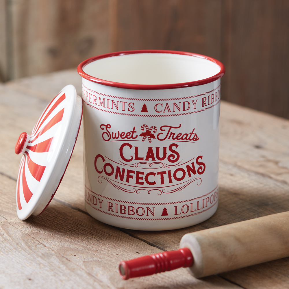 Keep sweet treats fresh and ready for Santa inside this Enameled Christmas Container! It features lots of sweets printed on its sides, perfect for Claus Confections. A peppermint is featured on its lid. Item is food safe.